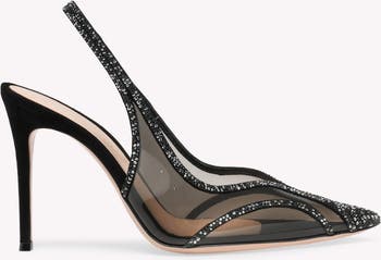 Crafted from supple suede and soft see-through Plexi, Brenda is a pointed-toe crystal-embellished slingback with a 95mm stiletto heel. The elastic ankle strap is covered in soft leather and ensures easy wearability. Handmade in Italy.