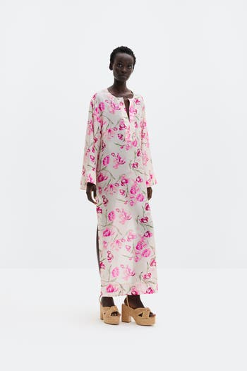 Luxurious silk kaftan, fluid drape and graceful maxi silhouette, painted florals for resort escapes and sunlit evenings.