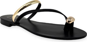 High-shine hardware and asymmetric straps bring stunning dimension to a minimalist slide sandal that will complement your day-to-night looks.