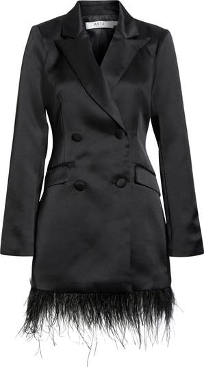 Feathery trim adds a fun flourish to this double-breasted blazer dress fashioned from smooth satin.