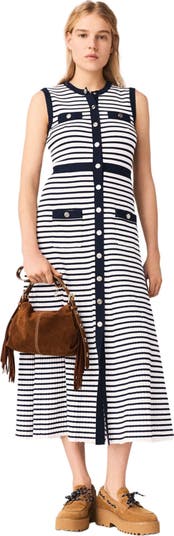 The Maje woman takes inspiration from the nautical world to assert a new kind of femininity that is both graphic and bold, where every detail elevates the look.Sleeveless maxi dress in a navy and white striped knit, fitted at the waist and then flared, embellished with signature gold-tone buttons and pockets. The crew neck, waistband and button placket that opens to reveal the leg create a subtle contrast of textures and lines.To create an elegant look, pair it with platform loafers and a suede Miss M bag.