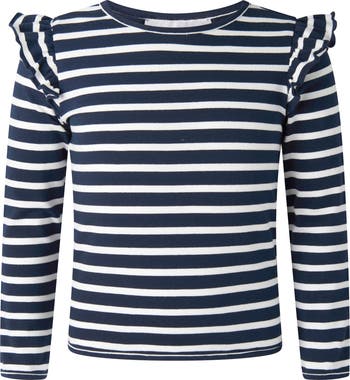 Give your little one a stylish and comfortable look with our Breton Stripe Ruffle T-shirt. Made from premium cotton, it features a classic navy and ivory breton stripe pattern and adorable ruffles on the shoulders. Perfectly pairs with our pinafores, leggings, or knitwear for a complete outfit.