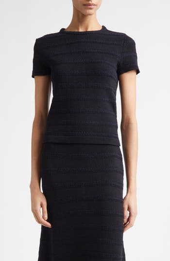 Knit with textural herringbone stripes, this short-sleeve wool-blend sweater brings a subtle nautical aesthetic.