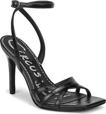 - Adjustable ankle strap with buckle closure; hidden elastic inset