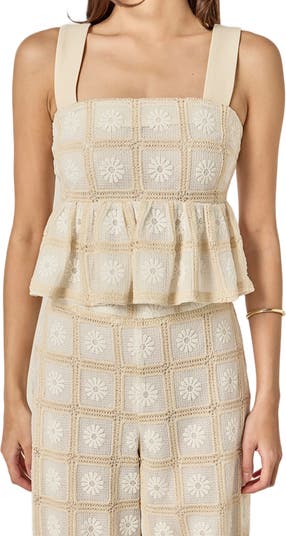 Embroidered lace lends a crochet-inspired look to this boho peplum top.
