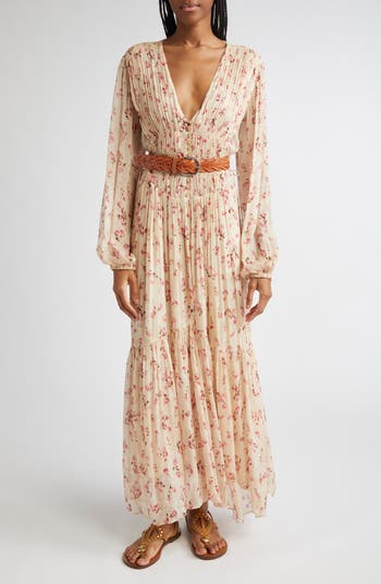 Soft florals sweep across this plunging maxi dress designed with a pleated, button-front bodice and delicate waist ties that draw in the silhouette with understated allure.