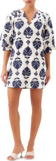 Voluminous sleeves sweeten the silhouette of this printed split-neck shift cut from crisp poplin.