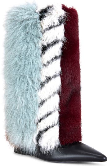 An extraordinary clash of faux-fur stripes in textures and colors not to be found in nature dials up the fashionable drama of this pointed-toe bootie.