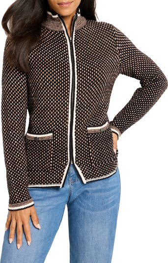 Two-tone brick stitches and complementary trim make this zip-front jacket an upscale take on a weekend classic.