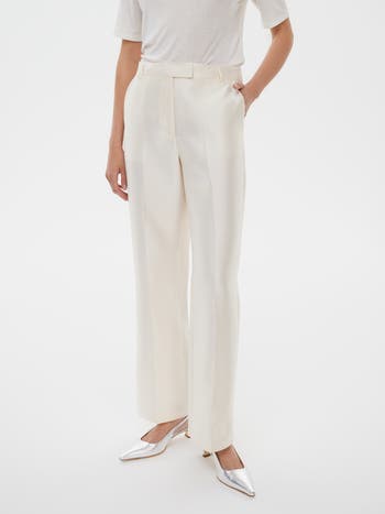 These high-waisted pants are crafted from a premium silk-wool blend, combining softness with structure. Designed with a straight-leg silhouette, pressed creases, inset side and rear pockets, and a hook-and-zip fly fastening, they offer a sleek, tailored fit for that elongated leg look.