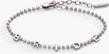 Discover our Bride Crystal Tennis bracelet, a contemporary take on a timeless piece. With sleek letters spelling ‘BRIDE’ on a sparkling crystal chain, it’s ideal for brides who appreciate unique style. Wear it solo or layer it with other necklaces to elevate any outfit, whether casual or formal. Perfect for all the events leading up to the big day!