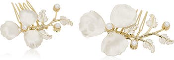 Garden magic and upscale glamour combine on this hand-wired set of hair pins adorned by dainty flowers dotted with imitation pearls.