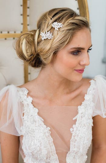 Shimmering marquise crystals arranged as luxuriant fanned-out leaves adorn hair pins that will perfectly highlight your bridal hairstyle.