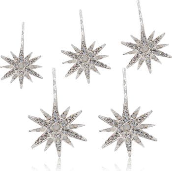 Show off celestial sparkle with this set of five special-occasion hair pins featuring starry motifs covered in dainty clear and opaline crystals.