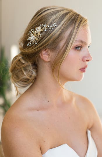 Hand-wired crystals are entwined in a lovely botanical pattern atop a gleaming hair comb that adds extra radiance to your updo.
