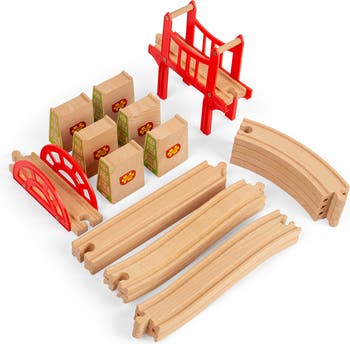 Creating individual rail features, such as bridges and viaducts, is a great way to develop your wooden railway network. This wooden Bridge Expansion Set helps make the most of every wooden train set play session and encourages imaginative play.A quality wooden train accessory that features 18 play pieces including two red bridges, six high-level blocks, ascenders, descenders, curves and straights. Little rail enthusiasts can take their toy trains to new heights, lows, twists and more!The bridge expansion wooden train set accessory is compatible with other items in the Bigjigs Rail range as well as most other major wooden railway brands. Made from high quality, sustainably sourced FSC® Certified wood. Conforms to current European safety standards.