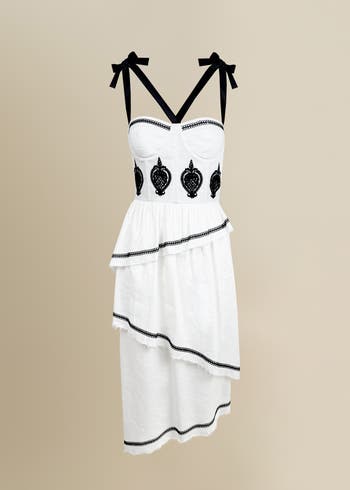 A midi dress designed in a comfortable, breathable stretch linen. Embroidered in India with fine thread to embellish the garment. Satin ribbon straps.