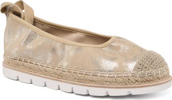 The BRIDGET merges contemporary flat styling with classic espadrille craftsmanship. This hybrid design features a lustrous metallic upper that catches light with every step, paired with a jute/rubber sole that delivers breathable comfort and natural grip. A distinctive tie detail at the heel adds elegance and style. Perfect for transitional dressing, this versatile silhouette bridges casual and refined aesthetics with understated sophistication.