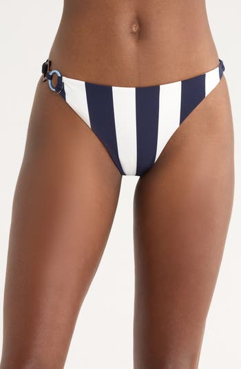Geometric clasps stand out against the side of classic bikini bottoms patterned in nautical-inspired stripes that exude resort-worthy appeal.