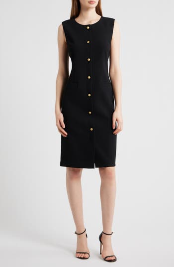 Gleaming, nonfunctional buttons stand out along the front of this tailored crepe sheath dress made with faux pocket welts.