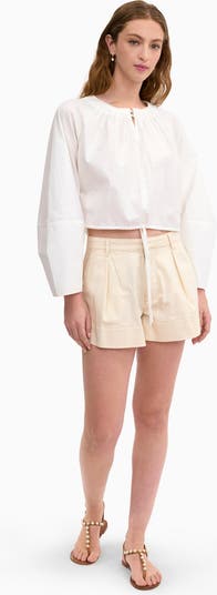 A modern cropped blouse featuring a neck slit and subtle elbow shaping for added structure. An elasticated back waist and functional front drawstring create a flattering, adjustable fit. Crafted in crisp solid poplin, it pairs effortlessly with high-rise trousers or skirts for a polished look.