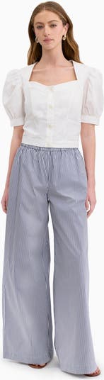 A fitted corset-style top crafted from crisp solid cotton poplin. The sweetheart neckline and sculpted seams create a flattering, structured shape, while short puff sleeves add soft volume. Finished with a functional button front, it pairs effortlessly with high-waisted skirts or tailored trousers for day-to-evening polish.