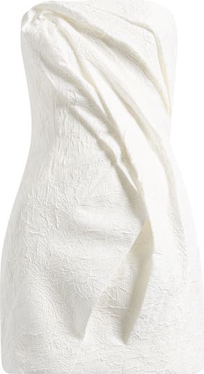 This sculptural minidress is cut from woven crinkle fabric with a structured strapless bodice and softly flared hem. Draped front detailing and textural frills add captivating dimension, making it ideal for bridal events.