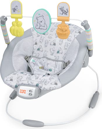 Babies can practice motor skills as they reach up to spin the Pooh Bear, Piglet & Tigger-themed toys dangling from above, including a bumble bee with rattle beads & honey pot with baby-safe mirror for self discovery! A deep comfortable seat, non-slip feet, and an adjustable 3-point harness help make this baby bouncer a safe spot for playtime. Vibrations and melodies will entertain and soothe your baby with just the flip of a switch. Easily move the removable toy bar and seat when not in use for storage or travel. Fabrics are machine washable and other parts wipe clean. For ages 0 to 6 months or up to 20lbs. Dimensions: 22.05" (H) x 20.47" (W) x 25.98" (L). No tools required to assemble. 3rd party tested and approved.