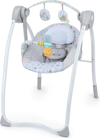 Swing into playtime with the Bright Starts Disney Baby Winnie the Pooh Classic Pals Milestone Swing! From newborns to active explorers, this swing offers two stages of fun as baby grows from reaching/batting to more advanced play. Younger babies can gaze up and reach for the dangling Tigger crinkle toy & sun plush toy with tags on the overhead toy bar. Older babies can grasp and interact with the bead chaser and spinning mirror toy on the lower activity bar. Keep baby calm and engaged with 6 swing speeds and TrueSpeed weight-sensing technology. Includes a 30, 60, and 90-minute timer. Play Winnie the Pooh inspired melodies to entertain baby while they swing. Maximize safety and comfort with 2 recline positions and a secure 5-point harness. This milestone swing is easy to clean with removable fabrics and folds compactly for storage or travel! No tools required to assemble. Designed for babies up to 9 months or 20lb. Third-party tested and approved. 4 C batteries required (not included). Dimensions: 37.01 in (H) 36.61 in (W) 23.82 in (L)