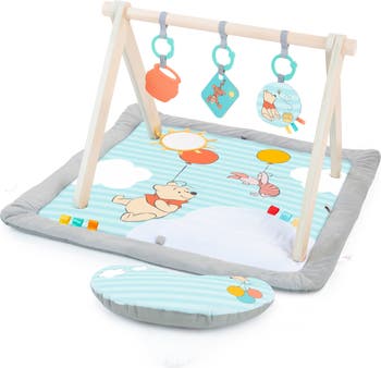 Bear to dream of sweet tummy time adventures with Disney Winnie the Pooh, Piglet, Tigger and more! The Once Upon a Tummy Time activity mat from Disney Baby and Bright Starts will bring your baby along on a play date fit for the Hundred Acre Wood. The soft plush mat features sensory tags for babys entertainment and a baby-safe mirror to encourage self-discovery. The durable, gender-neutral wooden toy bar comes with 3 developmental take-along toys. Baby will love to discover the Winnie the Pooh plush rattle with ribbons, Winnie the Pooh & Friends flash cards and honeypot texture toy. When playtime is over, the A-frame toy bar is easy to disassemble and lays flat for storage. This tummy time mat grows with baby from newborn to 12 months. Younger babies can use the included prop pillow for extra tummy time support, while older babies can sit up and play with the detachable toys. Toys wipe clean and the mat is machine washable for easy cleaning. Dimensions 30 x 30 x 18.5."