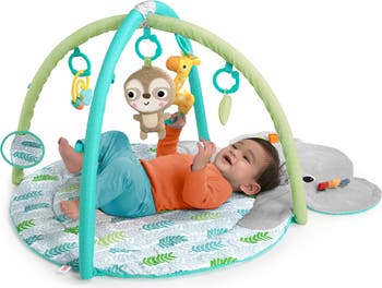 This sweet playmat will give your baby an elephant-approved hug with every playtime snuggle. The Bright Starts Hug-N-Cuddle Elephant Activity Gym creates the comfiest space for tummy time or lay-and-play fun. In any play position, your little one will have a blast shaking, rattling and squeezing the 5 take-along toys included, like our newest and loveably slooooooowest character the sloth! Captivate baby with fun activities during tummy time, like our engaging satin Taggies or peek-a-boo mirror. As baby gets bigger, you can remove the toy bar and transform the elephant into a cushy play mat and soft, cuddle-worthy friend. This plush activity gym will give you and baby plenty of room to snuggle for years to come.