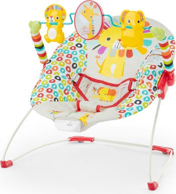 The best-selling Playful Pinwheels vibrating bouncer from Bright Starts is made just for your little one: a babies-only hangout where the only ticket to entry is adorableness. Spin up sweet moments with this unisex infant bouncer from the #1 manufacturer of bouncers*. This bouncer features a colorful pinwheel design and helps keep baby calm and safe with smooth vibrations and adjustable 3-point harness. A toy bar hangs above the bouncer seat with 3 cheerful toys including a lion, elephant, and baby-safe mirror that baby can spin and spin to encourage the development of motor skills. Say hello to cause and effect discovery with each reach and bat! When youre ready to scoop up your baby, easily move the toy bar out of the way or remove it from the baby bouncer entirely. With a lightweight and portable design, babys happy place can always be with you. Simply lift on each side when baby is not in the bouncer to move from room to room. Third-party safety tested and approved; designed in the USA; thousands of reviews. From the