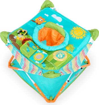 With the Bright Starts Pop N Jump Owl Forest, baby can jump into an enchanted forest indoors and out. From the #1 manufacturer of activity jumpers,* this compact portable jumper sets up in seconds for both indoor and outdoor fun. The removable canopy provides shade on sunny days and helps protect baby from UV rays (UPF 50+ protection). Easily take this lightweight jumper on the go as a safe place for baby to play in the park, at grandparents house, the backyard, and more. Built to grow with baby, 3 height adjustments mean youll only need one jumper as they develop. Your little explorer will love the included woodland-themed sensory toys designed to entertain and encourage fine motor skills: spinner ball, rattle, textured toy and mirror book. When playtime is over, simply fold the jumper back up and store in the included carrying bag. For ages 6 12 months or up to 25 lbs. Easy to clean with wipeable toys and machine-washable fabric. From the