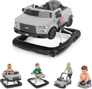 Let baby cruise in true American spirit with 4 Ways to Play: walker with car frame, walker mode without car frame, push-behind mode, and sit & play! Two kids can play at once in walker and push-behind modes for double the fun! The removable baby activity center includes authentic truck sounds, lights, a gear shifter, and a steering wheel made for exploring. Features sturdy wheels suitable for bare floors or carpet and adjusts to 3 height positions. Seat pad is extra comfy and machine washable for easy cleanup. Easy to set up and folds flat for travel and storage. For ages 6 months and up. This walker is thoughtfully designed to meet all required safety standards. Please follow all product warnings including never leaving your child unattended, keeping children away from hot surfaces and hazards, and blocking stairs before use.
