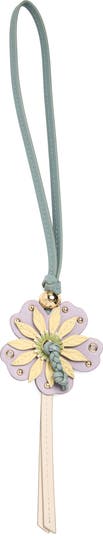 This softly hued leather bag charm from the spring '26 collection features a flower-petal design with a braided pistil and an engraved logo on the gleaming, golden bead. It can also be used to hold a key ring or worn as a wristlet.