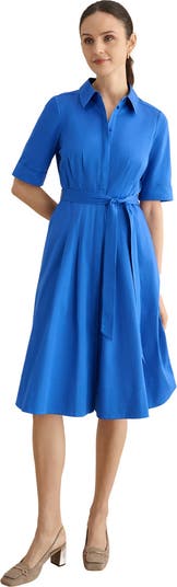 Tailored shirt dress featuring a cinched tie waist and flowing A-line skirt, offering poised day-to-night wear for work or weekend.