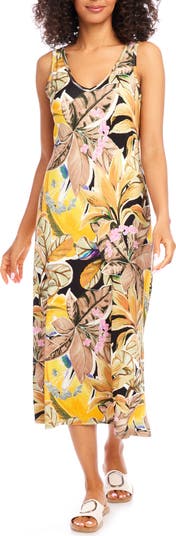Tropical blooms and foliage splash across a stretchy jersey tank-dress fashioned with V-necklines in front and back.