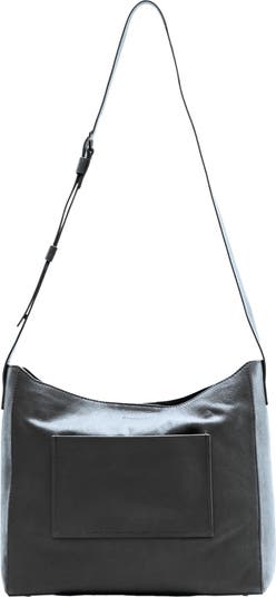Subtle logo debossing and a slouchy topline highlight the rich leather exterior of a spacious crossbody bag featuring multiple pockets and an adjustable strap for on-the-go convenience.