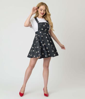 This adorable pinafore skirt is crafted in a sturdy fabric. The retro placket is secured with adjustable fascinators and complete with a back zipper, side pockets, and a bib pocket.