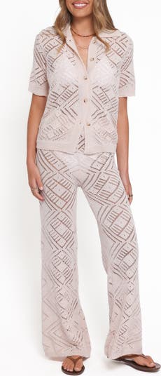 Airy openwork stitching lends warm-weather appeal to a matching button-up shirt and pants set that's guaranteed to be at the top of your packing list.