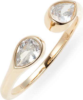 A polished open-band ring is anchored by drop-shaped, bezel-set cubic zirconia at each end, inspired by fresh air and open breezes.