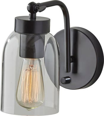 The simple geometry, exposed bulb and antiqued brass finish of this industrial-inspired lamp add intrigue to your living space, reading area or bedroom.