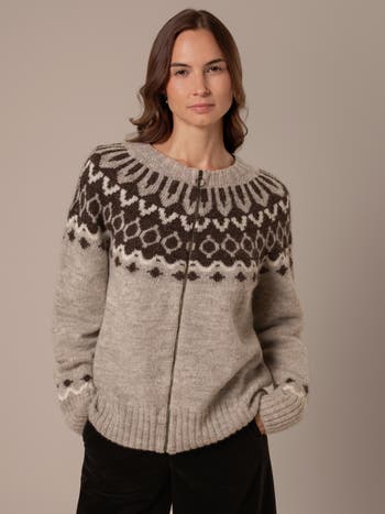 This Chevron Fair Isle Yoke Cardigan is crafted in Britain from British wool. It features a crew neck, central zip, and a yoke chevron Fair Isle design. Ribbed trims and Fair Isle detail on the cuffs complete this slightly slouchy, regular-length fit.