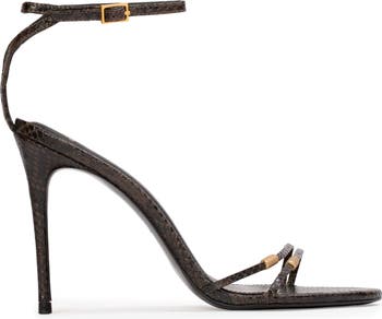 Round toe sandal with brushed gold bean studs, set on a stiletto pin heel. Made with printed snake leather.
