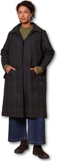 This trench coat, made in Britain, features a collared neckline and an oversized, longline trench shape. It also includes a removable hood for versatile styling.
