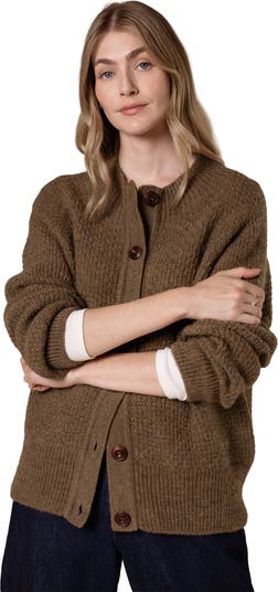 Crafted in Britain from undyed British wool, this moss stitch cardigan features a funnel neck, raglan sleeves, and a comfortable body fit. Finished with ribbed trims and natural corozo buttons, it offers warmth and texture.