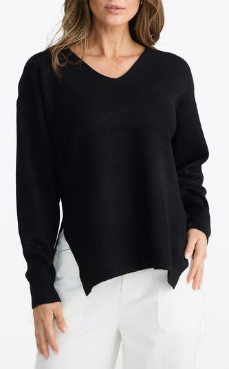 Side slits add a relaxed vibe to a staple sweater knit with a face-framing V-neck.