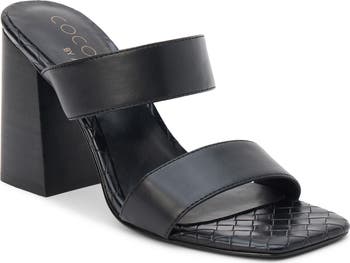 A lofty block heel elevates a slide sandal featuring a duo of straps at the vamp and a woven footbed for added texture.