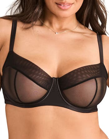 The black sheer mesh bra has an irresistible edge and features see-through, unlined cups, a supportive underwire, adjustable straps, and a hook-and-eye closure.