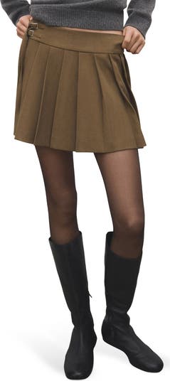 Sharp pleats enhance the flared silhouette of this woolly leggy-length skirt accented with slender side belts.